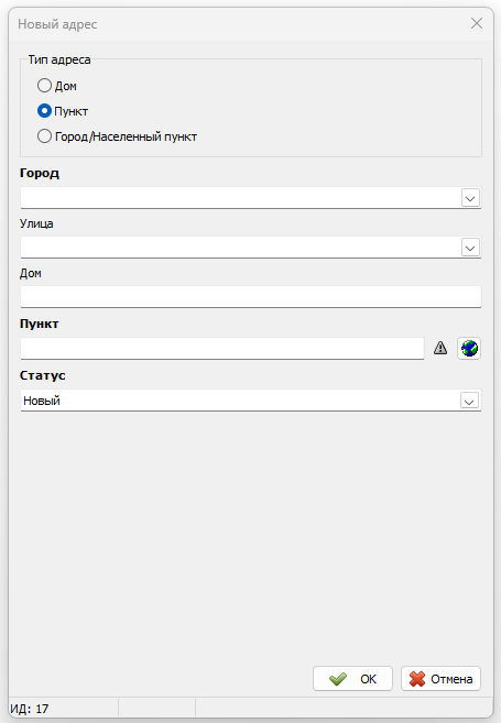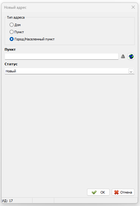 • Тип — «Дом», «Пункт» или «Город/Населенный пункт»;