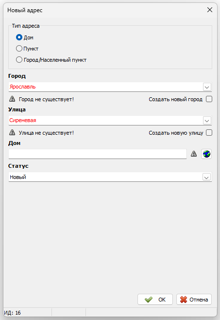 • Определить тип добавляемого адреса: «Дом», «Пункт» или «Город/Населенный пункт».