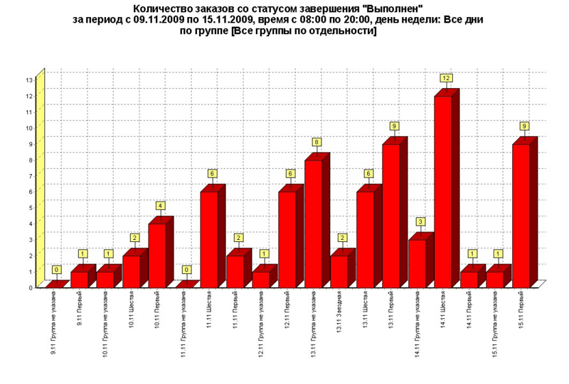 2. Детали: Количество заказов со статусом завершения ___ за период с ___ по ___, время с ___ по ___, день недели: ___ по группе ___.